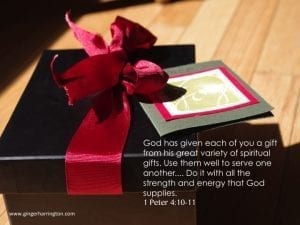 Use Your Gifts from God by Ginger Harrington | 0 comments Picture of a gift demonstrating 1 Petrer 4:10-11–God gives spiritual gifts . Submit a Comment Cancel replyYour email address will not be published. Required fields are marked *Comment * Name * Email * Website Δ This site uses Akismet to reduce spam. Learn how your comment data is processed.